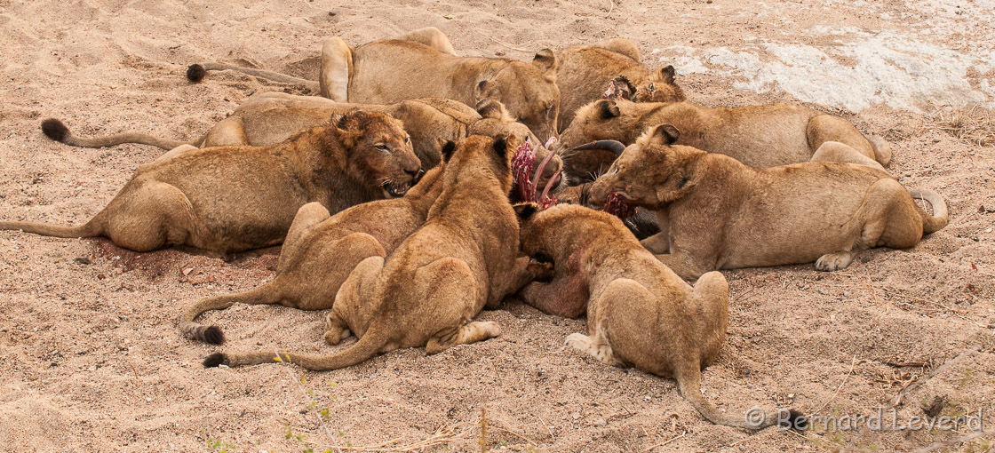 Lionnes et jeunes sur une carcasse (Panthera leo). Sabi Sand, Afrique du Sud.