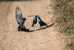 Combat de merles métalliques ; purple starling fight (Lamprotornis purpureus). Sabi Sand, Afrique du Sud
